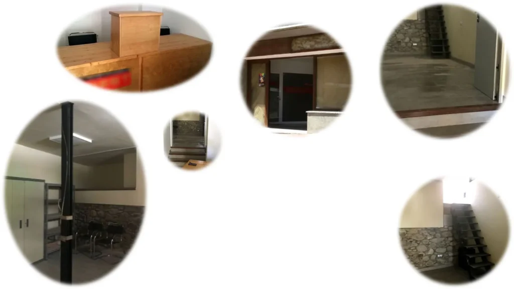 Es troba distribuït en dues estances, la primera amb una superfície de 12 m2 i un magatzem de 40 m2. Disposa dels serveis d’aigua i llum, tancaments d’alumini, sortida d’emergència i el magatzem compte amb portes tallafocs.